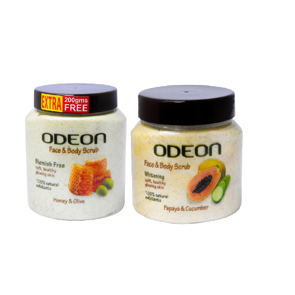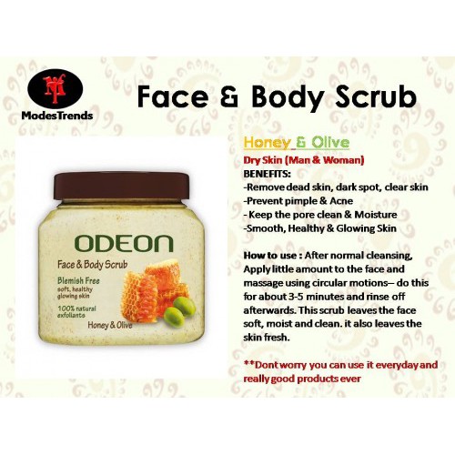 Get blemish free skin with a creamy ODEON face body scrub that has natural Honey Olive extract packed with exfoliating walnut shel particles. Odeon Face Body Scrub - enriched with Honey Olive Blemish Free For Soft Healthy Glowing Skin. Honey rich in anti-bacterial anti-inflammatory properties helps reduce.
